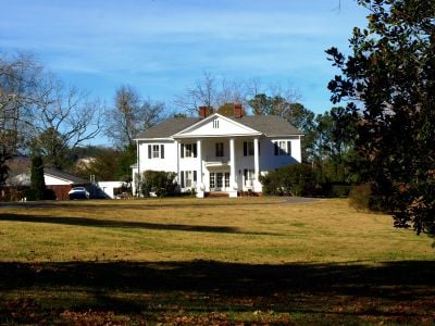 La Plantación Cherokee presenta columnas blancas de madera y elementos arquitectónicos del Renacimiento Griego distribuidos en una propiedad de 6.5 hectáreas.