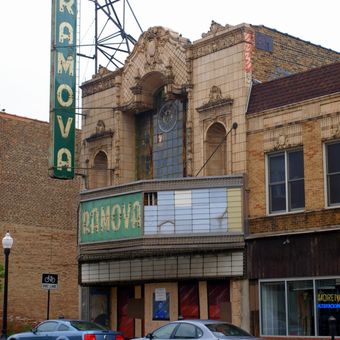 El Teatro Ramova se ubica en 3508-3518 South Halsted Street con sus ornamentos de terracota y detalles clásicos de yeso en la fachada española.