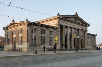 La Schinkelwache es un edificio de guardias de estilo clásico en la plaza Theaterplatz de Dresde, con fachadas simétricas, pilares de piedra robustos y filas de ventanas rectangulares. Actualmente alberga un centro de entradas para los lugares culturales cercanos y funciona como conexión entre su propósito histórico y su uso actual.