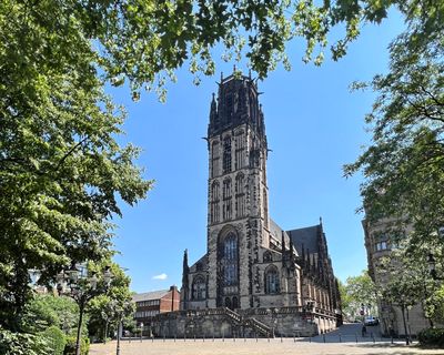 La Iglesia del Salvador se encuentra junto al Ayuntamiento de Duisburg, con una alta torre construida en piedra toba y elementos arquitectónicos góticos.