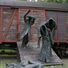 Die Rampe presenta un vagón de carga histórico acompañado por esculturas de figuras que caen, donde solo sus vestimentas permanecen visibles.