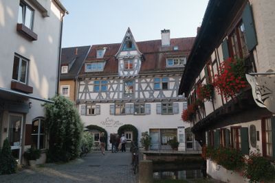 El edificio renacentista de dos pisos exhibe entramados de madera en su nivel superior y se encuentra en Schwörhausgasse número 4 en Ulm central.