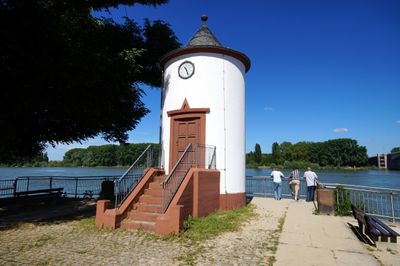 El Pegelhaus presenta una estructura redonda tipo torre con techo cónico, situada en la orilla del río Rin en el kilómetro 443.370.