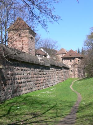 Laufertormauer, zwinger und Mauerzug der letzten Stadtumwallung zwischen Innere-Cramer-Klett-Straße und Pegnitz, um 1400, Zwingerbrüstung mit Kanonenscharten, an der Pegnitz bastionsartiger Zwingerausbau mit Kasematten, um 1540, Tunneldurchbruch des Hübnerstors 1