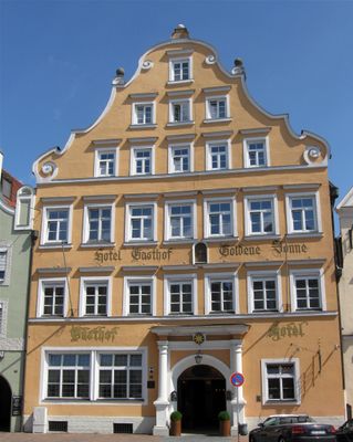 Ehem. Palais Pfetten, seit 1802 Gaststätte Goldene Sonne, stattliches dreigeschossiges Giebelhaus zu sieben Achsen, geschweifter Knickgiebel mit angesetzten Voluten, im Kern noch um 1700, bauliche Veränderungen 1876/81