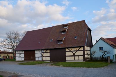 Ehemalige Zehntscheune, eingeschossiger Satteldachbau mit einseitigem Krüppelwalm und zwei Toren, Fachwerk mit Andreaskreuzen, Fuß- und gekehlten Kopfstreben, bezeichnet „1662“