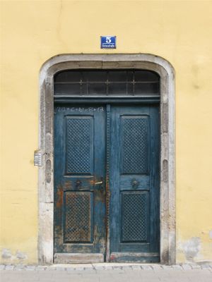 Portal, steinernes profiliertes Portalgewände mit zweiflügeliger, reich geschnitzter Haustüre, um 1769