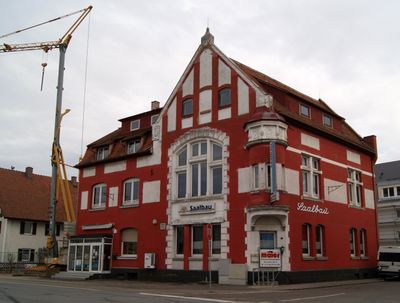Sogenannter Saalbau, zweigeschossiger, winkelförmiger Satteldachbau mit Erkern und reicher, historisierender Fassadengliederung, Anfang 20. Jahrhundert, später verändert