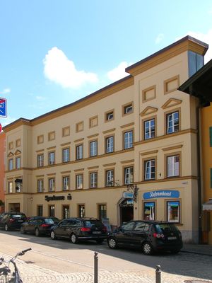 Salzburger Straße 2, 4, stattliche dreigeschossige Anlage mit Halbgeschoss, im Kern 17. Jahrhundert, Neurenaissance-Fassade mit Eckrisaliten und Vorschussmauer, 1878; schmiedeeiserner Ausleger