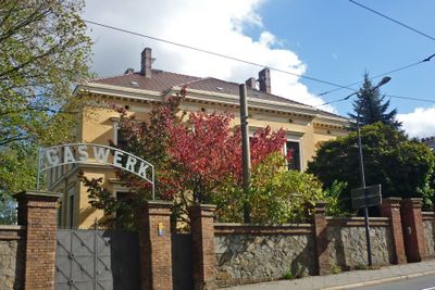 Verwaltungsgebäude der Städtischen Gasanstalt Lunitz 8, mit Garteneinfriedung als Weiterführung der Mauer Jägerkaserne mit zwei Toreinfahrten und Pforte von 1885 sowie Vorgarten Grüner Graben 21