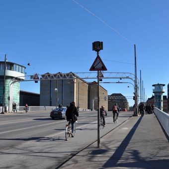 El puente se abrió en 1937 y reemplazó versiones anteriores, siendo la primera construida en 1620 bajo Christian IV. Este lugar siempre ha sido un punto de cruce importante para el comercio y la circulación entre la ciudad y el puerto.