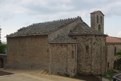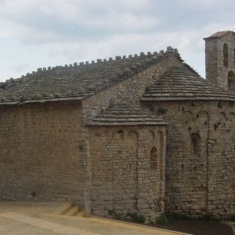 El edificio presenta tres ábsides, arcos semicirculares y una nave central con muros de piedra que muestran técnicas constructivas románicas.