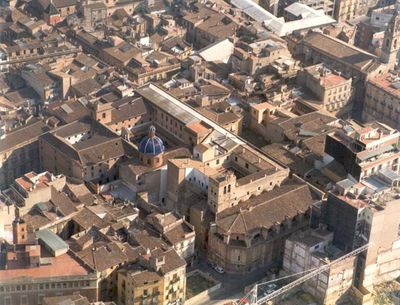 La Església del Salvador se encuentra en la intersección de las calles Salvador y Trinitaris, con muros de piedra y columnas ornamentadas.