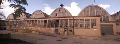 Dos edificios industriales paralelos con fachadas de baldosas de vidrio, estructuras de hormigón armado y bóvedas de 19 metros cerca de Gare du Nord.