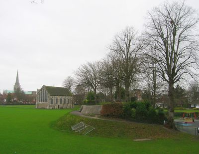 Chichester Castle, Ruinas de castillo medieval en Priory Park, Chichester, Inglaterra.