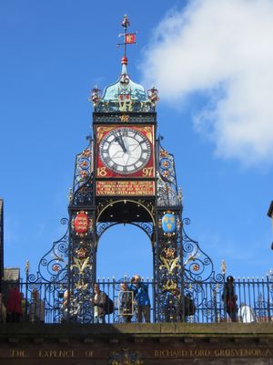 La puerta Eastgate exhibe tres arcos de arenisca que sostienen un paseo integrado en las murallas de Chester y una torre con reloj.