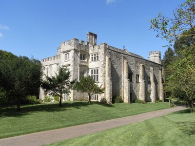 Old Shute House es una casa solariega medieval en Devon con muros de piedra gruesos, cámaras de techos altos y una chimenea notablemente grande en el salón principal. El edificio conserva su estructura original junto a ventanas góticas y varias extensiones de épocas posteriores.