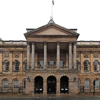 El Ayuntamiento de Liverpool exhibe un diseño georgiano con una cúpula central coronada por una estatua de Minerva sobre su escalinata principal.