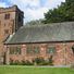 La Iglesia de San Juan Evangelista presenta muros de arenisca roja, un tejado de pizarra de Lakeland y una torre con contrafuertes diagonales.