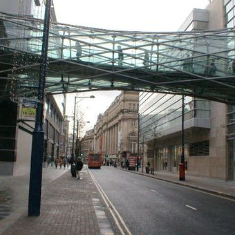 El Puente de Corporation Street presenta una estructura tubular torcida que conecta el edificio Marks and Spencer con el centro comercial Manchester Arndale.