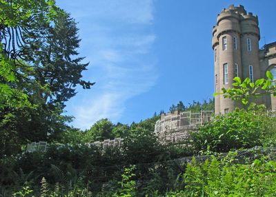 El castillo presenta una estructura neogótica con torreón cuadrado, almenas y una torre semicircular que domina el valle de Aberdeenshire.