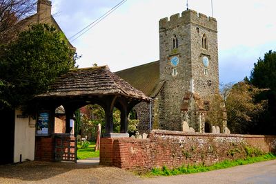 La Iglesia de San Pedro presenta una torre occidental construida con pedernal y conglomerado, incorporando elementos arquitectónicos normandos en su estructura.