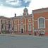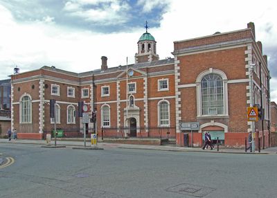 La Escuela Bluecoat presenta una estructura simétrica en forma de U en ladrillo con adornos de piedra, una cúpula octagonal y una estatua pintada.