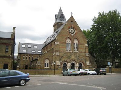El edificio catalogado de Grado II presenta arquitectura eclesiástica tradicional con detalles en piedra y elementos estructurales característicos del este de Londres.