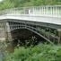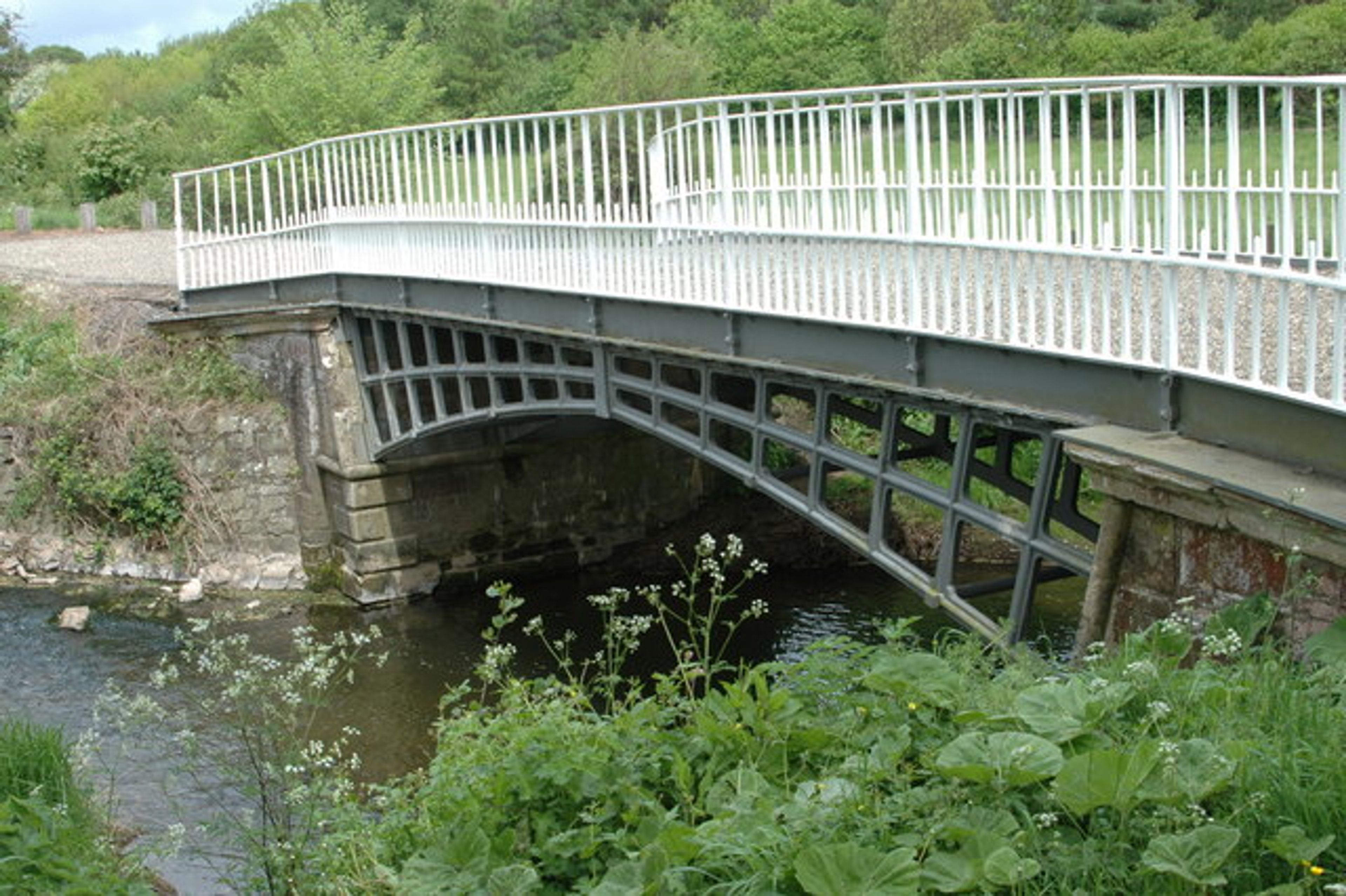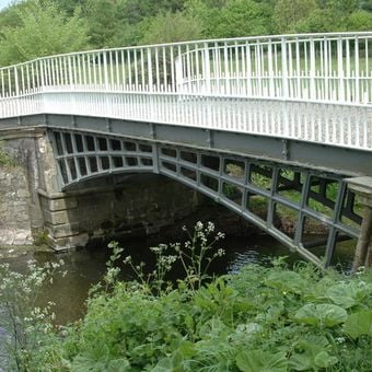 El puente de un solo tramo cruza el arroyo Cound con cuatro costillas de celosía arqueadas unidas por cinco elementos transversales de hierro fundido.