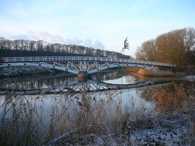 El puente Dutton Horse cruza la navegación del Weaver con dos arcos de madera de aproximadamente 30 metros cada uno y cuenta con un pilar central sostenido por columnas de ladrillo.