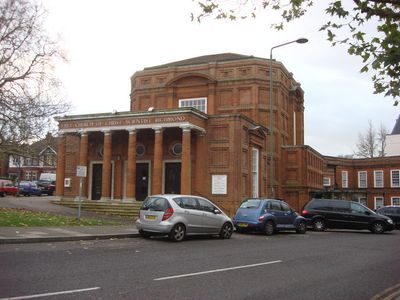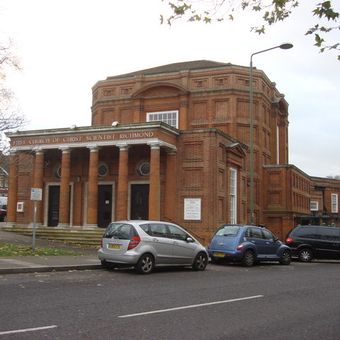 La Primera Iglesia de Cristo, Científico presenta ladrillo rojo con detalles barrocos, ubicada en Sheen Road en el distrito londinense de Richmond upon Thames.