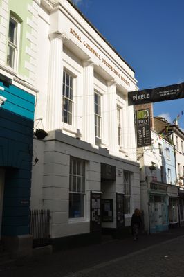 La Royal Cornwall Polytechnic Society ocupa un edificio catalogado de Grado II con grandes ventanales, galería y múltiples espacios expositivos en Church Street.