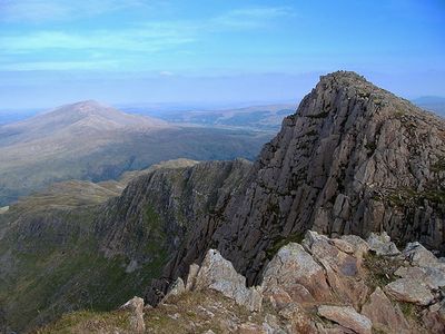 El Pico Este de Y Lliwedd alcanza una altura de 893 metros y presenta un afloramiento rocoso con vistas que se extienden por la cordillera de Snowdonia.