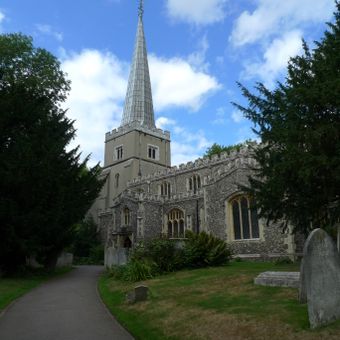 La iglesia de piedra se alza sobre Church Hill, con una alta aguja visible desde el noroeste de Londres y ventanas en lanceta del siglo XII.