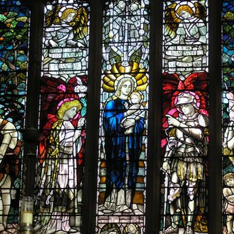 La ventana oriental de la Capilla de la Virgen, creada por Christopher Whall en 1891 en un taller de cobertizo, presenta figuras bíblicas mediante senderos basados en los Misterios del Rosario.