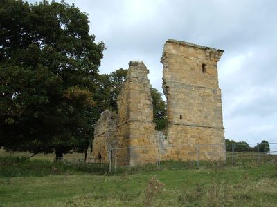Los restos de piedra del Castillo de Ayton se alzan sobre un terreno elevado cerca del río Derwent, con una estructura rectangular de tres pisos.