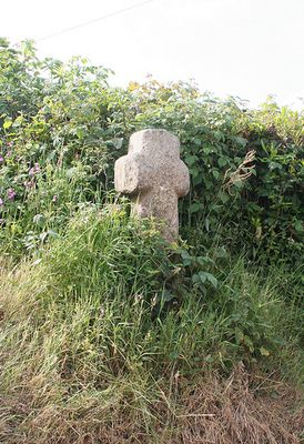 Wayside cross in the garden hedge of Southcott Cottage, at a crossroads called Southcott Cross