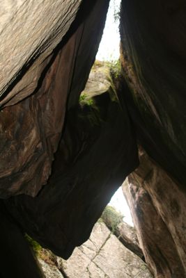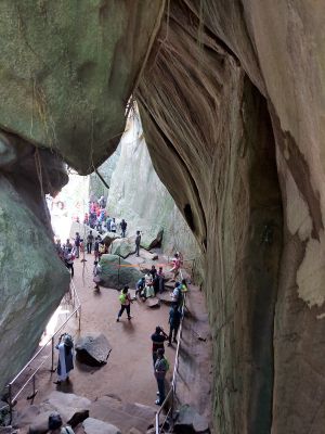 El nombre significa 'piedra en medio' en el idioma local, en referencia a una roca natural encajada entre las dos cámaras rocosas. Los visitantes hoy siguen el mismo pasaje estrecho que usaban los viajeros antiguos, pasando bajo la piedra encajada para entrar a la cámara superior.