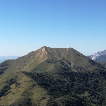 Monte Matanna se eleva a 1317 metros sobre el nivel del mar en los Alpes Apuanos, con senderos rocosos y bosques densos en sus laderas triangulares.