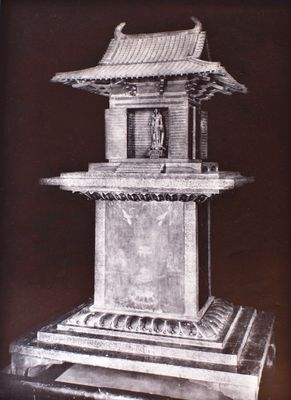 Los artesanos completaron este santuario en el siglo VII durante el período Asuka, cuando las formas de arte budista procedentes de China llegaron a Japón. En el siglo XIII, tres estatuas de Buda fueron robadas de su interior, cambiando el propósito del objeto de relicario activo a obra de arte histórica.