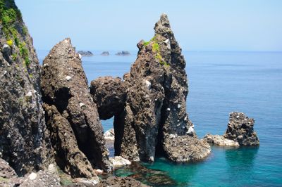 La estructura rocosa muestra patrones de erosión específicos que revelan las fuerzas geológicas activas en esta parte de Japón.
