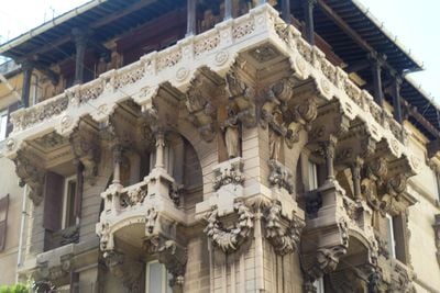 El edificio muestra la integración de elementos del Art Nouveau con estilos arquitectónicos italianos tradicionales, marcando un período relevante del diseño de 1900.