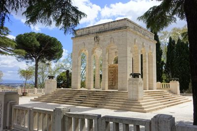 El mausoleo de granito presenta un cuadripórtico con tres arcos redondeados en cada lado, elevado sobre una escalinata con braseros de bronce.