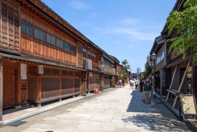 Nishi Chaya-gai es un barrio de entretenimiento en Kanazawa con estructuras tradicionales de dos plantas que bordean calles estrechas empedradas. Los edificios presentan ventanas de celosia caracteristicas y fachadas de madera oscura, con casas de te activas que continuan albergando actuaciones de artistas tradicionales.