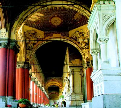 El cementerio contiene numerosos monumentos de piedra y tumbas dispuestos en filas sistemáticas, con una capilla central coronada por una estructura cupular.