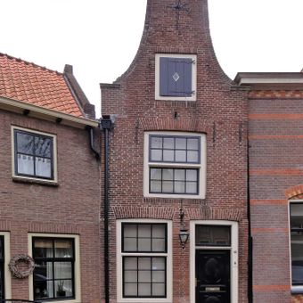 Huis met klokgevel met geveltop met natuurstenen aanzetvoluten en topstuk met jaartalcartouche en schelpversiering