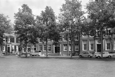 Pand met lange gevel met rechts en links vleugels, gebeeldhouwde middenpartij, mansardedak