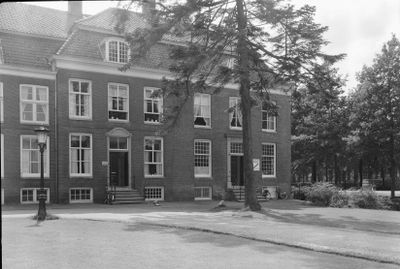 Pand met lange gevel met rechts en links vleugels, gebeeldhouwde middenpartij, mansardedak