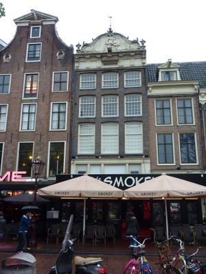 Pand met gevel onder rechte lijst met triglyfen en consoles, waarop een groot gesneden opzetstuk met windvaan, building in Amsterdam, Netherlands