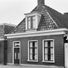 Pand tegen brede topgevel onder zadeldak met topschoorsteen